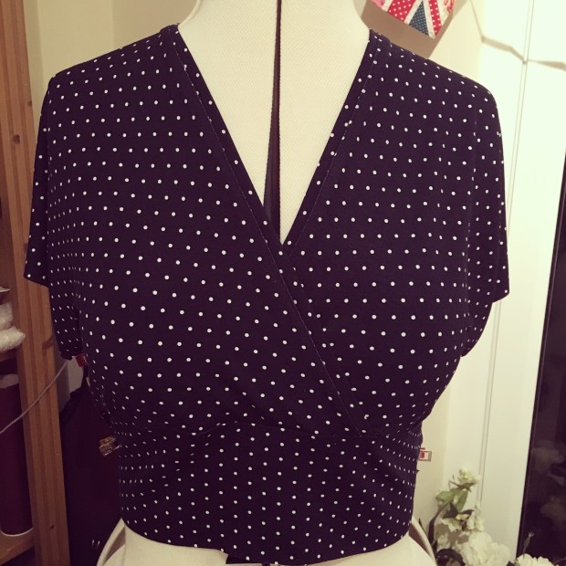 So that was a success with the fabric I didn’t really care about. Time to have a go with something I did love! Which was a much lighter weight much stretchier navy polka dot. I did give rotary cutting a try and found it a really accurate way of cutting knits. Also a really great way to scratch your table and I never could get the hang of shuffling the mat underneath the fabric to cut the next section without everything bunching up and losing your cutting line. So I found a much better solution of going and buying a much bigger cutting mat. Problem solved!
