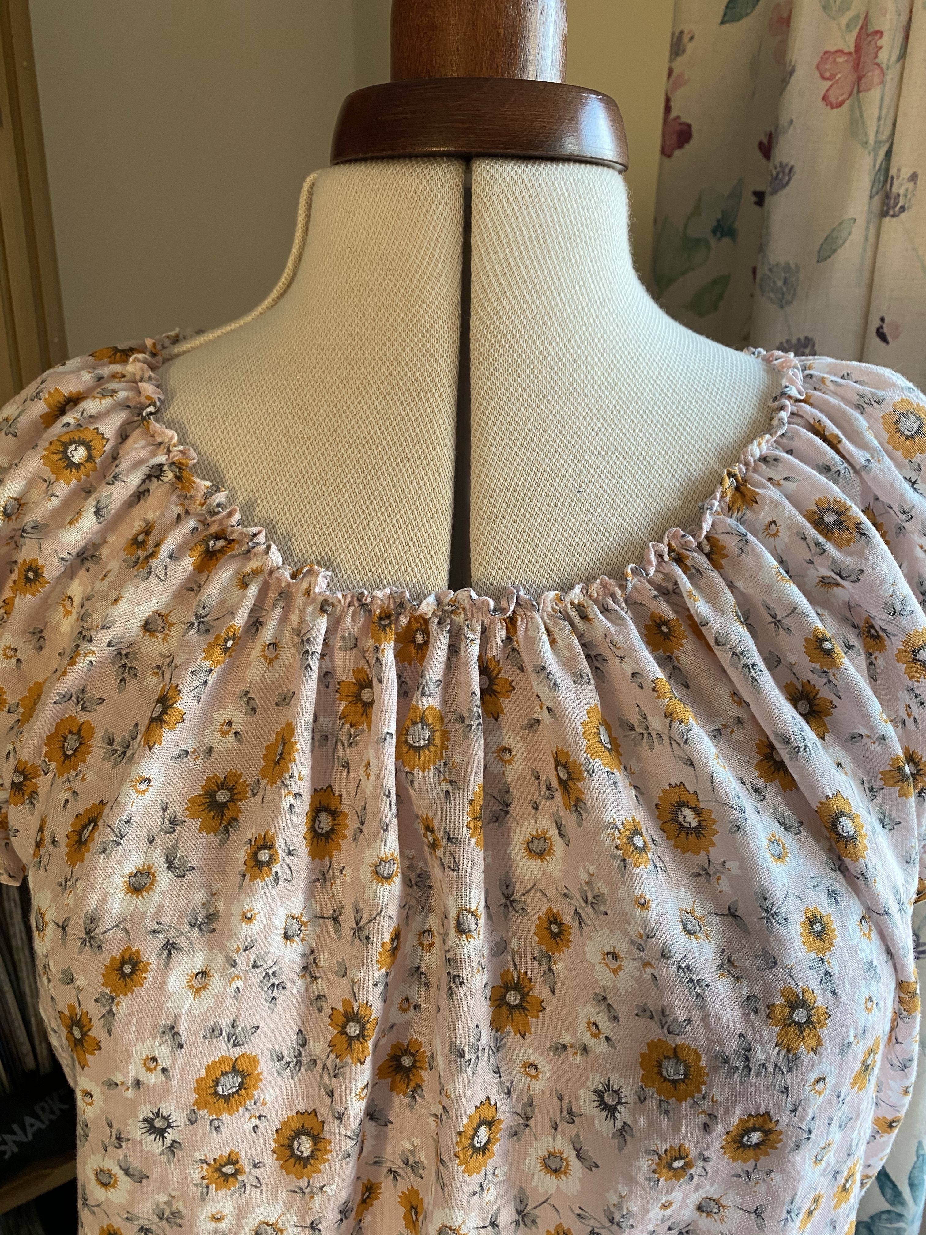But the effect is everything I’d hoped for! I’d really wanted to somehow give the gathered edges of the poesy a crisper look and putting the first line of shirring 1/2 inch away from the edge did just that. I added the second line in super close, just 1/4 inch away. I’d even be tempted in a future version to attach a teeny amount of delicate lace to the hem before shirring for the ultimate “pretty maid in the meadow” finish.